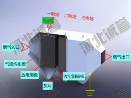 高压电晕放电使得粉尘产生荷电,荷电后的粉尘在电场力的作用下到达集尘板/管。通过喷嘴和布水管喷水将沉积在收尘板上的粉尘冲洗下来,带有粉尘的液体沿着收尘板流入下方集斗液。避免二次扬尘,可达到很高的除尘效率。
