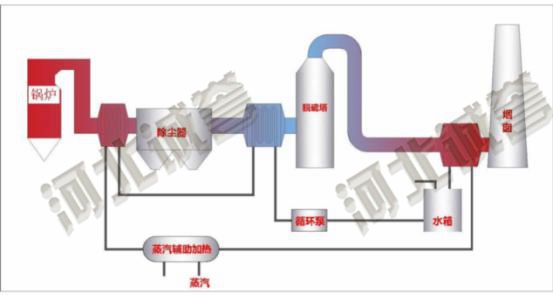 脱硫塔入口烟道设置烟气冷却系统吸收高温烟气中的热量对热媒加热,加热后热媒进入脱硫塔出口烟气加热系统对烟气加温,经加温后的烟气再排放,可显著降低白烟视感。当脱硫塔前端烟气热量不足以加热后部烟气时,可通过蒸汽进行辅助加热。